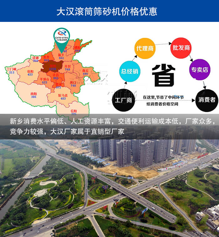 河南新鄉(xiāng)是國(guó)內(nèi)有名的“振動(dòng)篩之鄉(xiāng)”,分布有300余個(gè)滾筒篩砂機(jī)廠家,設(shè)備全、選擇廣,同時(shí)調(diào)查顯示,新鄉(xiāng)地區(qū)銷售處的滾筒篩砂機(jī)價(jià)格普遍低于廣東、北京、上海等省份,分析原因如下: