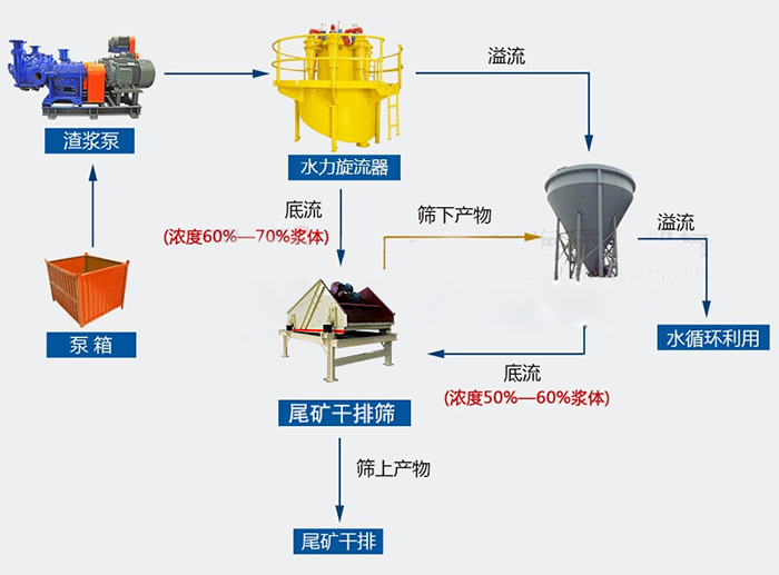 尾礦干排工藝采用旋流器預(yù)脫水,尾礦脫水篩再脫水的技術(shù),脫水后的煤泥及尾礦含水量只有10%左右,可直接通過傳送帶輸送到指定地點(diǎn)進(jìn)行干堆或礦車運(yùn)輸,尾礦或精礦漿分離出來的水可通過柔性橡膠管排放至回用水系統(tǒng),煤泥分離出來的水可通過柔性橡膠管排放至另一水倉或附近水溝。