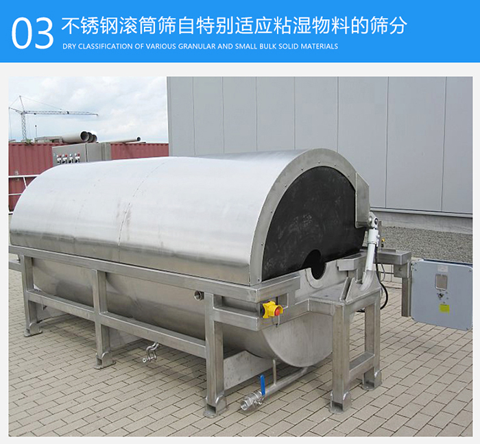 三、不銹鋼滾筒篩自帶料倉,料倉下部有扇形閘門,粗料段有溜槽可以將粗料直接送到運輸機械,便于工藝布置。圓回轉(zhuǎn)篩在汲取國內(nèi)外同類產(chǎn)品各項優(yōu)點并經(jīng)多年實踐而發(fā)展起來的新型篩分設(shè)備。其透篩率高,特別適應粘濕物料的篩分,篩孔不易堵塞。