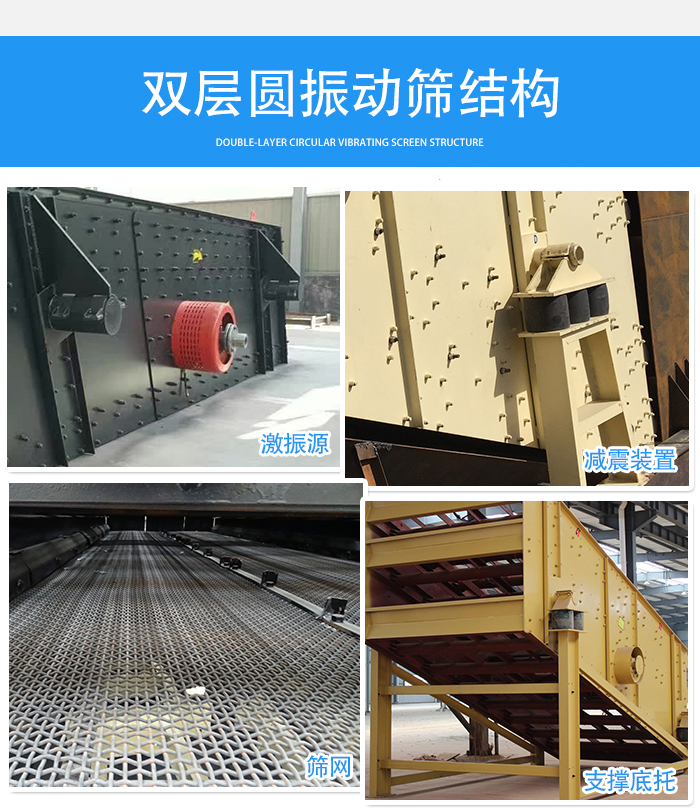 雙層圓振動(dòng)篩由振動(dòng)源,篩體,篩網(wǎng),減震裝置和底托組成,篩機(jī)側(cè)板采用優(yōu)質(zhì)鋼板制造而成,側(cè)板與橫梁,激振器底座采用強(qiáng)度螺栓或環(huán)槽柳釘連接,結(jié)構(gòu)合理,堅(jiān)固耐用。
