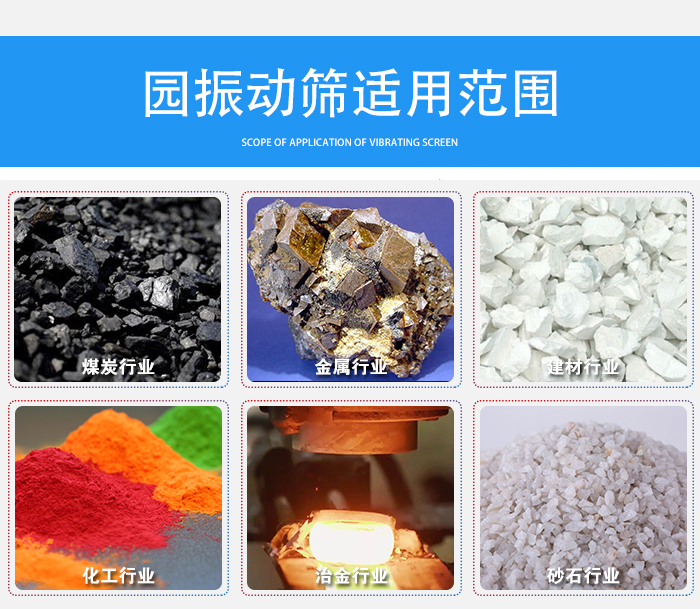 可應(yīng)用于選礦、建材、電力、輕工和化工各行業(yè)對(duì)各種顆粒狀和小塊狀散固體物料的干式分級(jí)。園振動(dòng)篩篩箱運(yùn)動(dòng)軌跡為圓,適用于煤、石灰石、碎石、砂礫、金屬或非金屬礦石及其他物料的篩分。