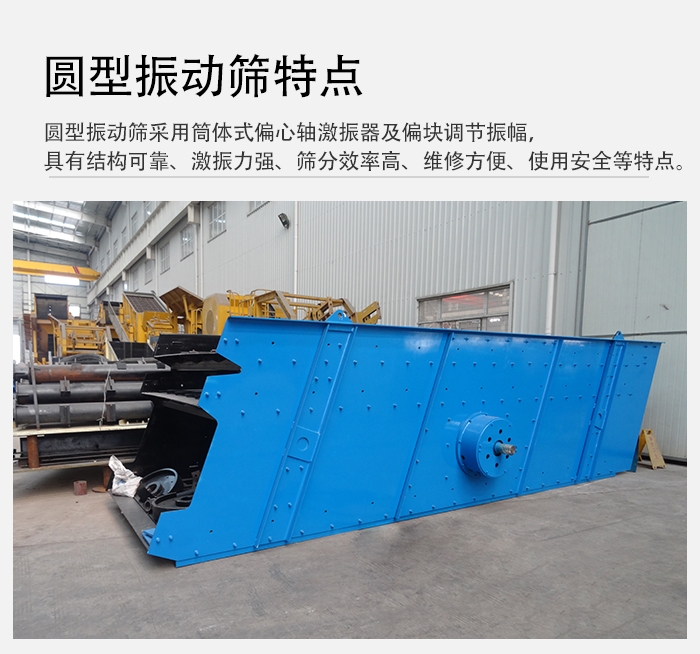圓型振動(dòng)篩采用筒體式偏心軸激振器及偏塊調(diào)節(jié)振幅,物料篩淌線長(zhǎng),篩分規(guī)格多,具有結(jié)構(gòu)可靠、激振力強(qiáng)、篩分效率高、振動(dòng)噪音小、堅(jiān)固耐用、維修方便、使用安全等特點(diǎn),