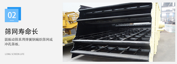 2、圓振動(dòng)篩采用彈簧鋼編織篩網(wǎng)或沖孔篩板,使用壽命長(zhǎng),不易堵孔。